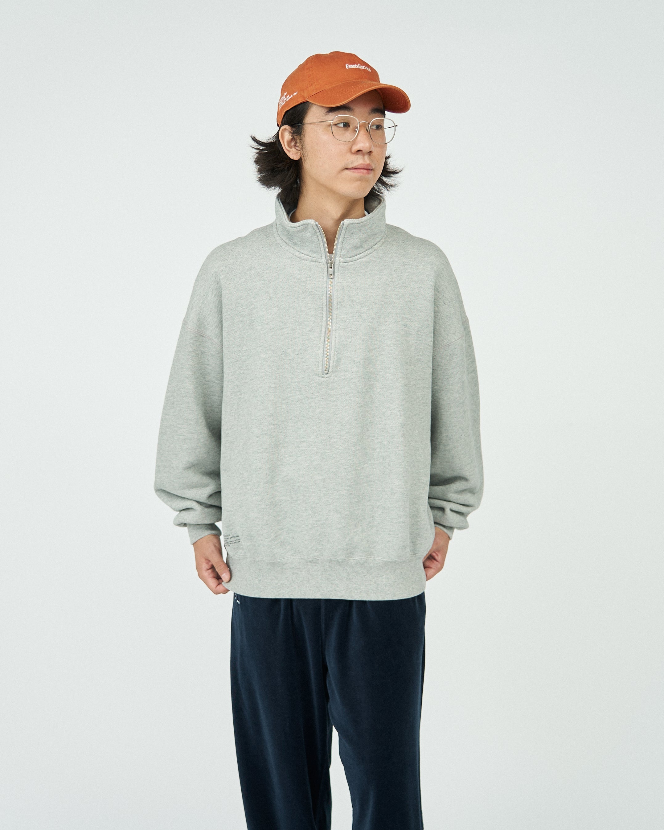 しっかりとしたタフな風合いを感じられるスタンドカラーのハーフジッププルオーバー。90年代のストリートカジュアルをイメージしたハーフジッププルオーバーは身幅からアームまでゆったりとしたルーズフィット。表面はクリーンな表情でありながらしっかりと目が詰まった肉厚な生地に。